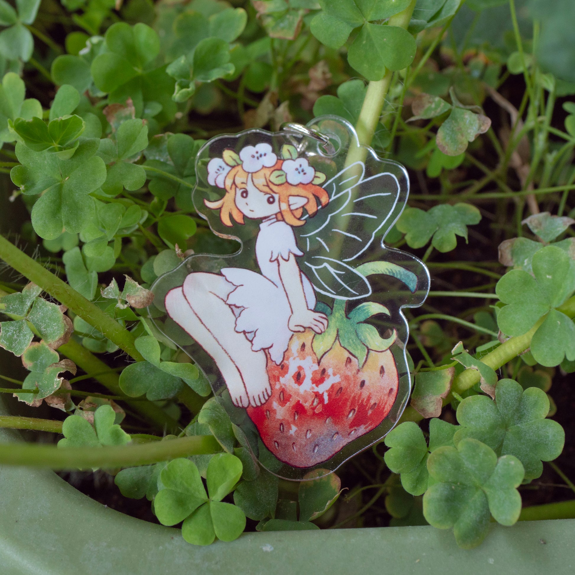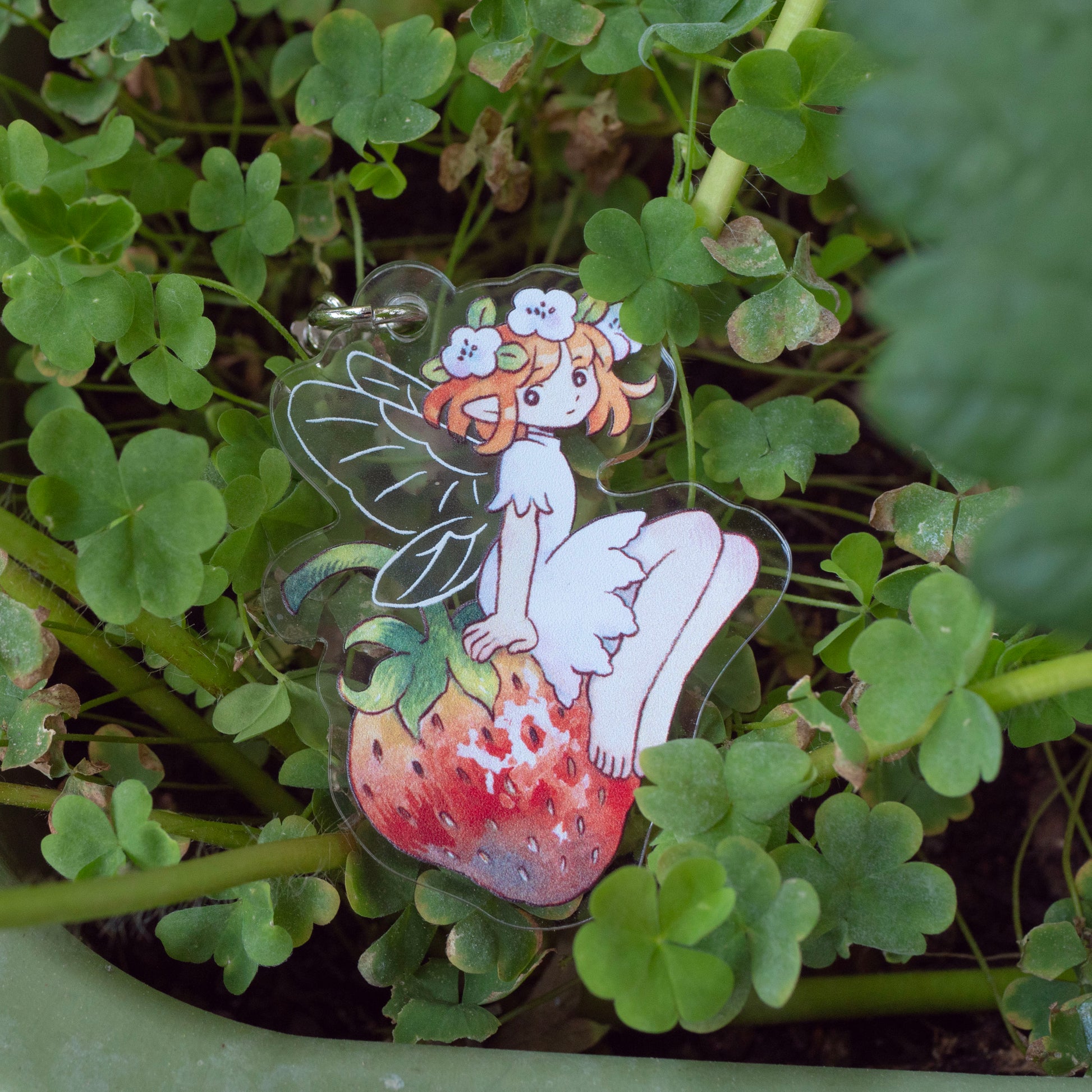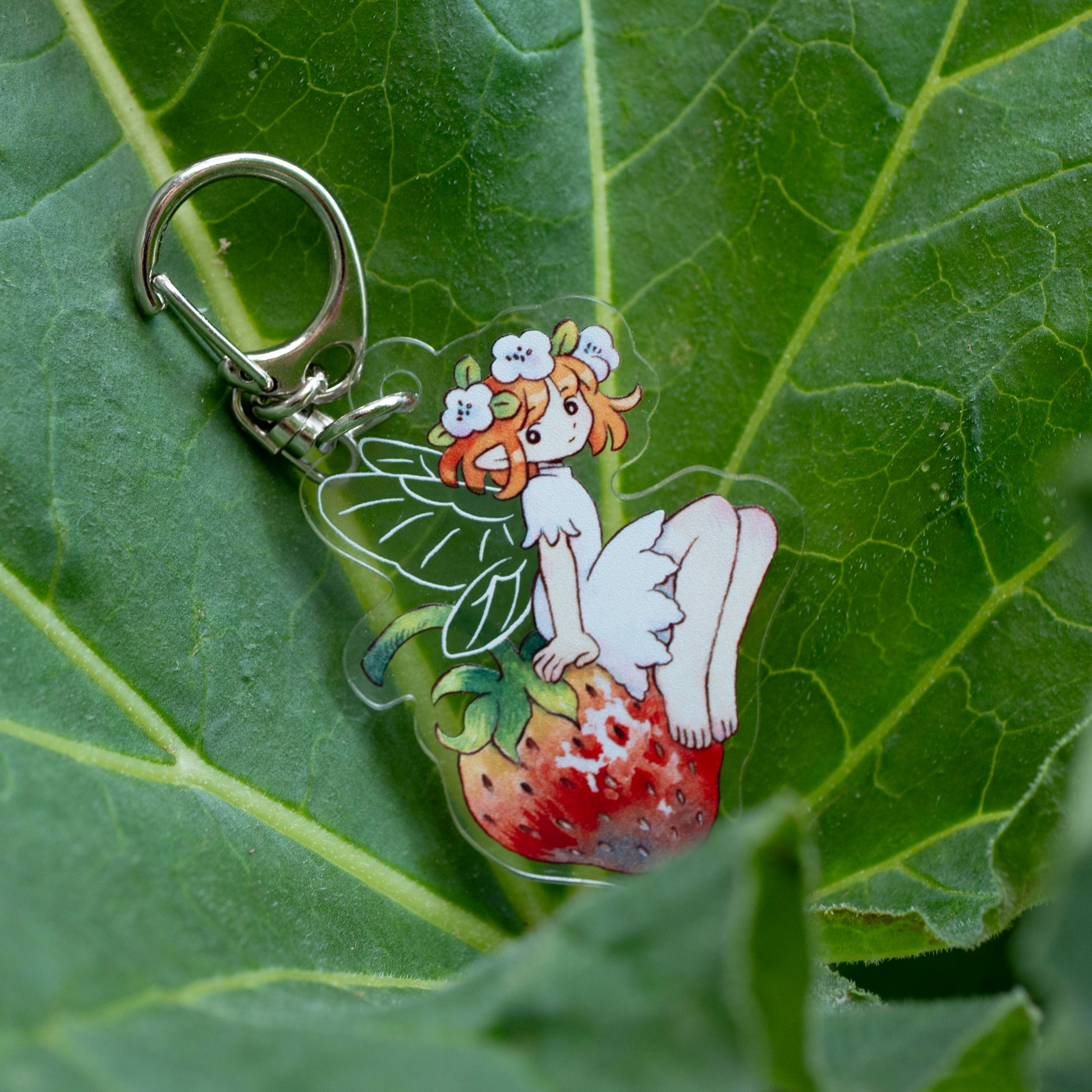 あまいイチゴの妖精が描かれたアクリルキーホルダーです。イラストは両面に描かれています。