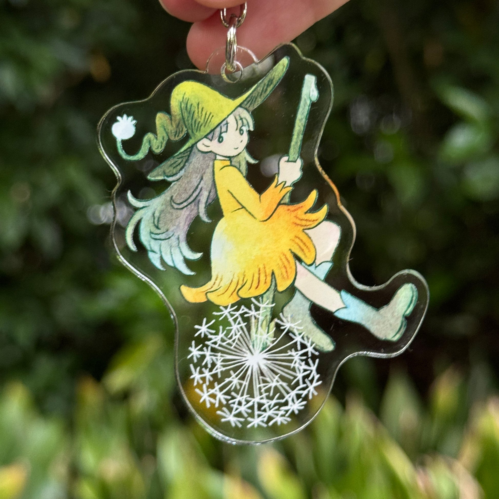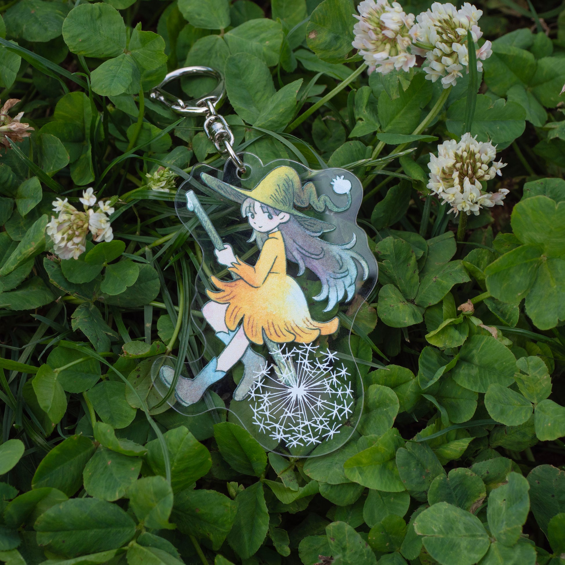 アクリルキーホルダーです。タンポポをほうきにして空を飛ぶ、ちいさな魔女のイラストが両面に入っています。
